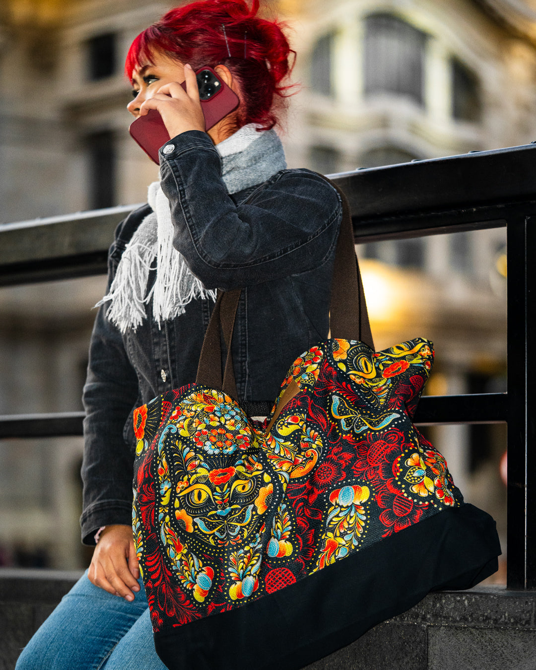 Inspirada en la identidad cultural de México, esta bolsa combina arte mexicano moderno con funcionalidad urbana. Su formato amplio y resistente la hace ideal para el uso diario, viajes o actividades creativas, manteniendo siempre una estética sofisticada y auténtica.